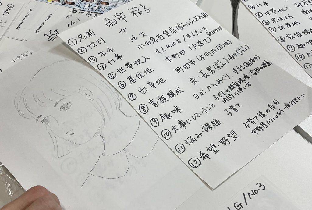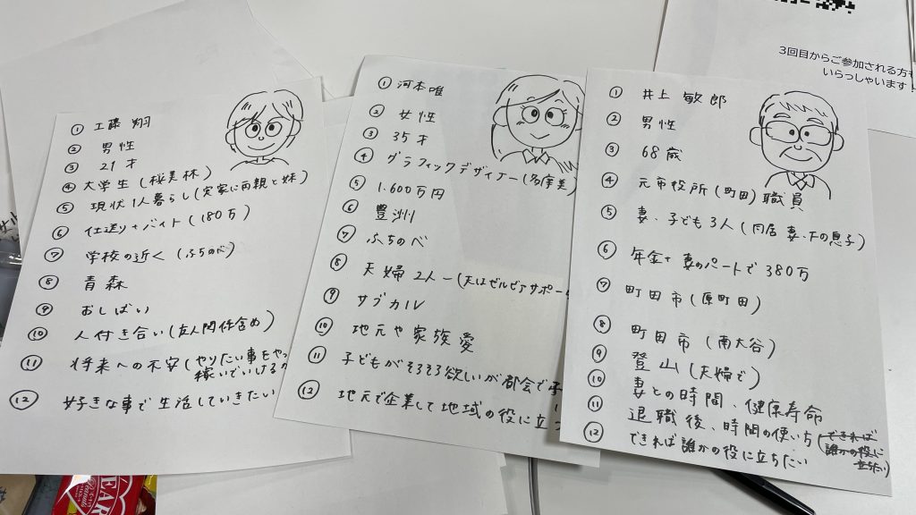 各グループは、12の要素(年齢、性別、家族構成、趣味、悩み、希望など)を盛り込みながら、町田で幸せに暮らす人物像を3人作り上げていきます。